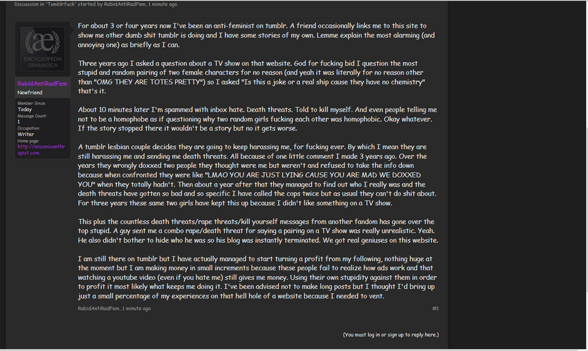 Her exploits on the internet go far and wide, starting with constant slapfight on various fandoms, pretending to be a lesbian for attention while writing a LOTR worth of rape fanfics about Hannibal, David Bowie and Hugh Laurie before jerking off to them, and ending with a recent visit to our own EDF2 that ended with threats of calling the police on us.