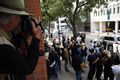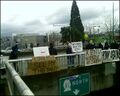 Meanwhile, we were blessed the presence of Lord Xenu, dressed in his typical glorious blue robes. Xenu stood by the bus stop, microphone in hand, encouraging us to chant and sing "Happy Birthday" to L. Ron Hubbard. Armed with a good boom box, we played music, enticing the anons to dance their hearts out (and dance they most certainly did). Kudos to those who put the music collection together! We sang the theme of "Fresh Prince of Bel Air" together, danced to Eddie Murphy and Rick Astley, and there was even a little Dragonforce. As cars passed us on the street, our signs encouraged many to honk for us, and in gratitude, we cheered. Interestingly enough, we encouraged police and a fire truck to honk for us. Local news cameras arrived and interviewed half a dozen protesters. Around noon, the party van showed up with cake, water, and more tunes. After the party van rolled up, we moved once again.