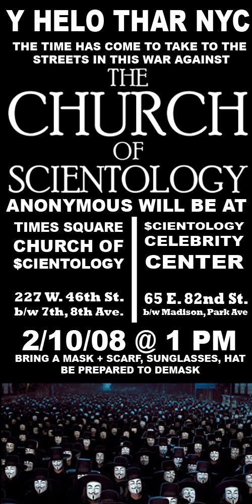 Posting on Protest.Net: http://protest.net/pdxindymedia/index.cgi?span=event&ID=850127&day=10&month=2&year=2008&state_values= "In light of recent and previous attempts by the Church of Scientology to suppress negative media, we're using this opportunity to increase public awareness about the church's activities.