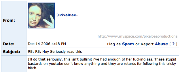 On January 8th, 2007, Pixelbee, under her newest YouTube sockpuppet LoveHateStudios, posted a video stating that she was leaving YouTube for LiveVideo.com. She stated she thought LiveVideo.com was a better overall site, with the video quality being better, etc. What it all really meant was that she was sick of being trolled on YouTube. Despite the move, PixelBee is still fat, ugly, dangerous, and lusting after our cars. She also made a post on her LiveVideo Forum saying she missed the drama. Let's not leave her to her misery.