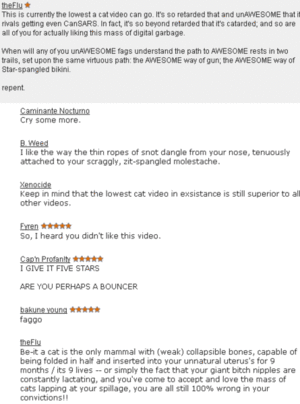 Once upon a time, theFlu launched a second assault on this page and all things lulzy. In the name of absolute butthurt, they fucking cried about everything; as an example, previous fuckingly retarded statements like "the soundtrack to a fagdance", in reference to users crying over content being low-voted, have been lazily censored by ; changed to more epic lines, like: "the fags will pile up, and bans will be had," ...which fucking rules. Effectively these "cool guys" have built a bathhouse over a smoking ruin, trying to cure ED of theFlu's babybutt bullshit