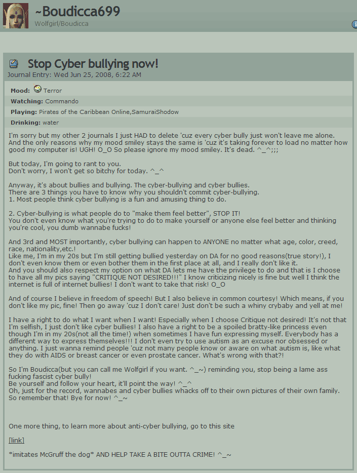 Lochnessmonstor727 met up with Wolfbitch on YouTube after what seemed like a year to tell her about a fabulous site that is vastly superior to devianTART-- FurfagAffinity. Seeing this as an opportunity to obtain a bigger hugbox, Wolfshit instantly joined the site. While establishing her fucktard presence among the menagerie of sick fucks, she hoped that her special brand of bullshit would go unnoticed by the "trolls" she met on dA as long as she didn't use the name "Boudicca". But because Wolfgirl possesses just under -9000 braincells, she was wrong as usual! Snarkfags on WTF_FA took notice in almost no time and instantly recognized her from dA, but have been too lazy to continue covering the retard's antics any further. Despite lack of documentation, the shit Wolfbitch has been pulling has hardly gone unnoticed. In the few months that the princess lasted on the site, Wolfshit would face adversaries again and again while claiming to have "flashbacks" of the shit that went down on back then on dA. Just like dA, her FA page also gave her a new outlet to overreact to various incidents in her pathetic life, such as this entry posted on June 29, 2009 but was deleted a few hours later after the issue was supposedly resolved (or Wolfshit actually felt embarrassment for posting something so idiotic for once):