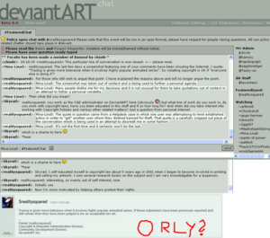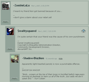 Realitysquared soon fucked things up to the extent that his subordinates were later placed under Community Relations and told to report to someone else, but that didn't really matter since they were just as incompetent as him and later got the shaft. One of Daniel's biggest fuck-ups was placing a complete sociopath named subversive-imaginati as a member of the policy enforcement staff. After going on a psychotic rampage and banning over a dozen artists for trivial or non-existent reasons, she was eventually removed from her position along with her co-worker (who were the only two people left serving under RealitySquared). Afterwards it was revealed she had a history of abuse and was seeking professional medical help and psychological counseling. Go figure.