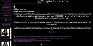 This article got featured on the front page of VampireFreaks.com by the site owner, outing Ryle as a pedophile. Lots of stories and accusations start coming out and many members quit Ryle’s cult LeaveMyKidzAlone.