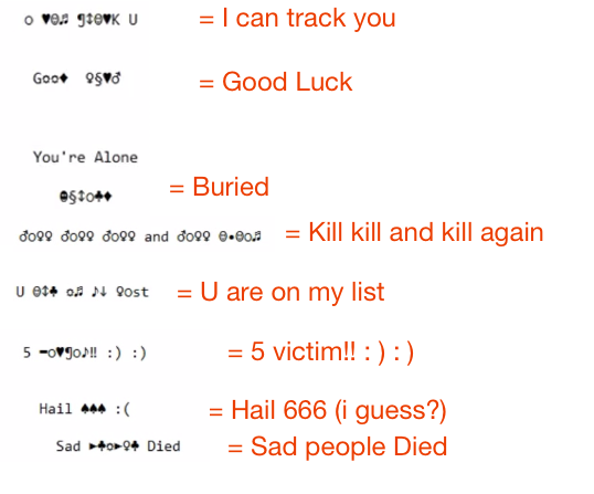 Along with the random pictures, there is a white screen that flashes up on your screen which contains some random Wingdings characters. As it turns out, these characters aren't random at all; they are actually coded messages intended to threaten the player.