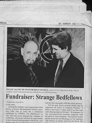 In 2002, a Christian minister calling himself Jess LaVey started going around claiming to be Anton's estranged son and accusing him of all manner of lulzy acts such as raping him and beating him with a crowbar. Sounds about right based on our knowledge of Dr. LaVey, doesn't it? Except birth records prove that LaVey only had three children (at least one of whom did hate him, but Zeena Schreck is no Christian), and it's pretty clear from other writing - such as this "affidavit" full of cruise control and strong indications of severe schizophrenia, in which Jess accuses George H.W. Bush of colluding with Anton to commit ritual murder - that "Jess LaVey" is a fucking insane Christian sham artist looking to capitalize on Satanism's image problem and make a name for himself as a crusader against it. And wherever have we heard before of a batshit, attention-hungry asshole making outrageous claims about his early life and then trying to inaugurate his own dopey religious movement? Wait, don't answer that.