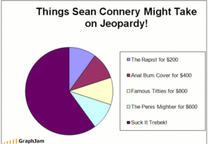 While most celebrities shrink away from the harsh treatment that Saturday Night Live puts them through when they attempt to satirize an actor or actress, Sean Connery and the Connery legend only made the SNL Celebrity Jeopardy skits much more noteworthy and powerful. By depicting Connery as a bitter old senile star with a penchant for ANAL BUM COVERS, SNL briefly latched onto the awesomeness of the Connery phenomena. SNL, realizing that they had something actually funny on their program for a change, milked the “Connery Effect” for all it was worth by making several sequel skits before resuming to their normally shitty and unfunny programming. On the internet, the clips were linked and watched and linked and watched over and over becoming funnier and funnier with each successive viewing. Nobody ever grows tired of Connery sparring intellectually with Trebek. It is not uncommon to read some internet poster replying to a thread by simply stating “The Rapists for 800, Alex.”