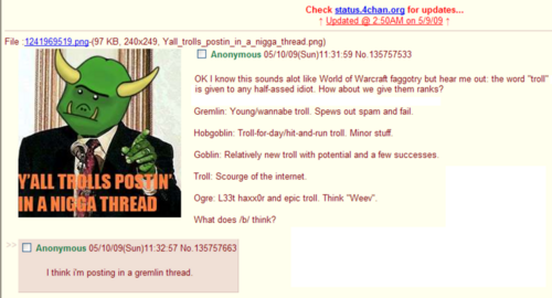 Self-Troll-I am a fat cunt with no life outside the internet. I'm a waste of air also. My existance is an error. I am the reason for all bad things in life. I have terrible taste in music and stupid beliefs and ideas. I am a complete fail in life. I dwell in my mom's basement because I have no social life. I have no point in life and might as become an hero to make the world better. I'm just an ugly whiny loser who shouldn't have existed.