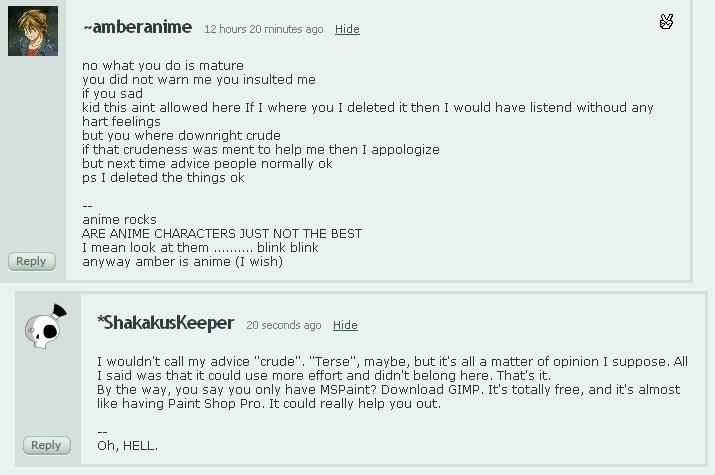 Amberanime's bitchfest on one of Shakakuskeeper's pics. According to her sig, she also wishes to be an anime character. Lulz.