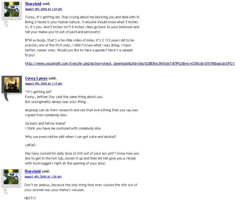Sharolaid has a AWESOME Boyfriend. It recently came to attention that Sharolaid has been hiding his ugly ass boyfriend from all of his online followers. His boyfriend name is Gary. At first it was said that he was a relative who took the homeless Sharolaid a couple years ago but actually Gary is a faggot with low self esteem who tested positive for HIV in the early 1980s when AIDS first came around and Gary was still a teenager and had teeth. In return for somewhere to live Sharolaid calls Gary his boyfriend even though they cant have sex because of Garys AIDS and Sharolaid really does not love him. They live in a small shack with the only people who associate with them - the homeless cats of the neighborhood. This relationship is pathetic. Gary begs Sharolaid for sex and Sharolaid begs Gary for meals. Gary locks Sharolaid in the shack while he is at work which is why Sharolaid is always online. He has nothing to do or nowhere to go. Gary is secretly jealous and wants "fame" too but Sharolaid never lets him be seen because he doesnt want people to point out the obvious - HOW UGLY, OLD & DISGUSTING GARY IS and that this relationship is disgusting. Gary is jealous and a pedophile. Sharolaid is using him for money and a place to stay.