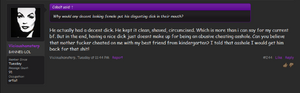 She followed up by sharing embarrassing stories about what a loser he is, how he threatened to kill himself when she dumped him and giving a general picture of what kind of person he is: A jobless, closeted, druggie failure who lives with his mother who hates him and who deals with problems in real life with subterfuge on the level of fifth grader much like he does on the internet. And who's only purpose in life is "winning" on the internet and trying to join troll sites that cast him out like a leper due to his massive faggotry.