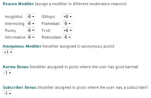 The Slashdot moderation system was designed to raise good posts and denigrate poor ones. Its simplicity has been its downfall. It has been mostly successful at removing first post and crap floods, but rather than discourage trolling, it has elevated it to an art form. By relying on a point system (named, without irony, "karma") it provides a built-in scoring mechanism. A comments karma score can range from -1 to +5. Competing trolls can grade themselves as easily as a baseball game.