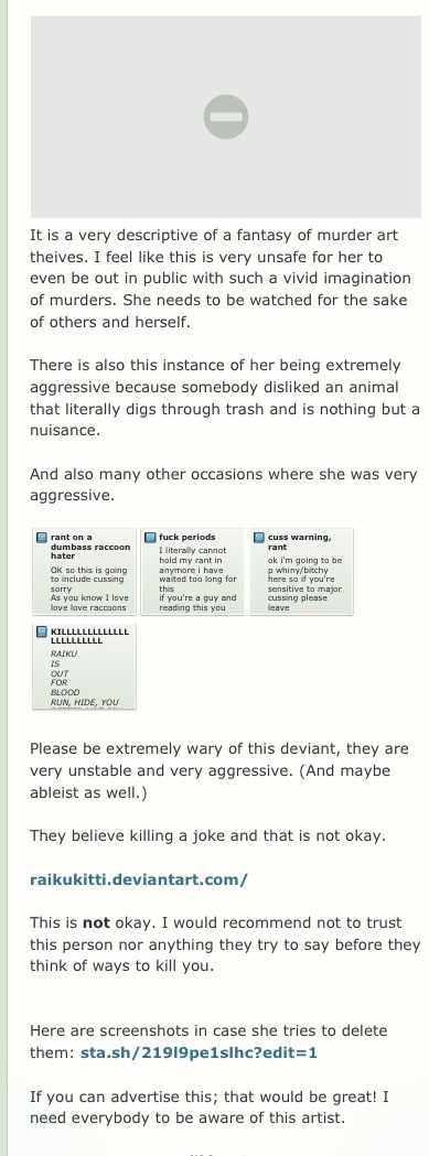 Many idiotic insults were thrown about, but in the end, raikukitti was BAWWlocked from deviantART.