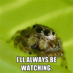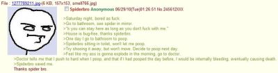 Spiderbro is a meme that originated from a greentext story thread in /b/. Spiderbro is the only species of spider that doesn't have you on the list of things to bite today. He's always looking out for you and sometimes even getting you laid. The greentext story was about a guy that met a girl and took her home to have sexy time. This got interrupted because Spiderbro bit the cumdumpster’s left tit, and she ran out of the house screaming. The writer was pissed because he was still a virgin, so like any other guy would, he proceeded to fap. Little did he know the girl was riddled with AIDS. He soon found out that this spider had been a total bro and saved him from Gay Cancer. This is very unlike a spider, because their normal activities include biting you and fucking your shit up. /b/tards reading the thread collectively told their share of Spiderbro moments, and thus the Spiderbro meme was born. When you finally realize how incredibly shitty your life is, remember, Spiderbro is watching.