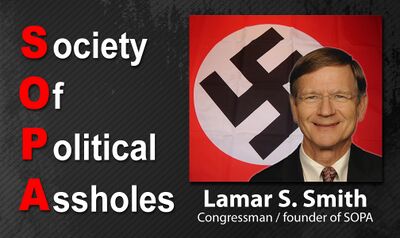 The Bill was put up for proposal by a bribed Texan fuck, who like all Texans are absolutely notorious for taking bribes from companies. Lamar Smith, who got bored of parenting his children, and decided to take up some good old fashioned Texas hobbies, such as swapping money for morals and getting himself a big fat campaign donation from the RIAA and MPAA. "After all," he must have though, "this boat that is the United States is sinking anyway! Might as well shoot a few holes in the bottom and profit handsomely!" Smith clearly looks up to his brother/cousin, George Bush, who is responsible for the Patriot Act. With this the beginning of the end was nigh for the Internet. With the deep pockets full of money and Texan Justice, the RIAA and MPAA along with their fuckbuddies over at the BSA, paid off enough congressmen to put the bill on the fast track to an easy pass. The phone number for Lamar Smith's DC office is 202-225-4236, in case you ever want to call him up and tell him what a motherfucking douchebag he is.