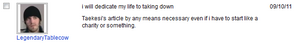 Upsetting a true legend like Tablecow may cause him to slit his own throat and use a paint brush to write your name on something that's very near to him. Tablecow admitted to have thoughts of cutting himself, but has excuses not to do so (HINT: because he's a bigger pussy than an emofaggot). This truly is a sign of being a mental disturbed individual, however Tablecow admits that he's nothing more than a resource wasting abomination that needs to be removed from this planet. BUT! He now realized his destiny: his purpose to remain alive in this world is having the permission to worship Taekesi. He believes that being called a Legende by Taekesi will make him more than a failure .