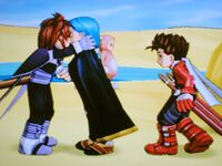 Eventually, an "innocent" half-elf called Mithos befriends Lloyd and the others. Because they're all idiots, they don't stop to consider that the half-elf who looks just like Yggdrasill might actually be Yggdrasill. Then Mithos reveals himself to be Yggdrasill. OMG! But before that, Lloyd and the others "accidentally" destroy a village and kill thousands of people when they release the final seal, which is arguably the only cool thing they do throughout the game (although they do blow up several fortresses as well, which is also pretty cool). Then Zelos betrays them (depending on the ending you choose, you can either make up with him or kill him), and they confront Yggdrasill. Yggdrasill's goal all along was to use a compatible Chosen to become a vessel for his dead sister, then remake the entire world's population with mindless, soulless zombies. This would apparently end racism towards half-elves (although one could argue that half-elves not acting like complete assholes would be an effective method too). Lloyd and his friends call Yggdrasill out on his bullshit, kill him and reunite the two worlds with the magic sword, Martel gets reincarnated by stealing some worthless robot's body, the magic tree grows again, and everyone lives happily ever after. Until the sequel. Then, many thousands of years later, this happens:
