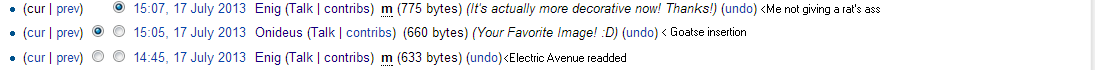 17:32, 17 July 2013 (EDT)- Onideus you were the one who started changing images for goatse (in other words, vandalizing) and deleting ENIG's comments. Do don't cry now that someone is reverting your blanking and backpedaling. An admin vandalizing a page, what a professional you are. --Rustler 17:33, 17 July 2013 (EDT)