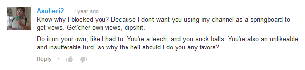 Sadly this is one where we don't have exact images of Asalieri starting drama on the TGWTG forums, it is safe to assume his comments were removed if they are indeed as bad as people were saying they were. The reason I say he was banned from there is because there is a post on there, albiet I don't know if it is there or not, which stated that he knew who Asa was and that he remember he tried to start stuff with him on the forums as well as others and then got banned for it. I will try to screen cap that later but it will probably be a bitch to find now. 10:27, 9 September 2013 (EDT)