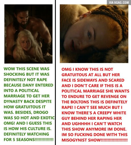 - Mostly about how GRR Martin defended the SJW when the SadPuppies thing happened at the Hugo awards and a few months later feminist decided they are boycotting the show after a scene with a "rape". Even though there was an almost exact same rape scene in a previous season, only the rapist was hot.