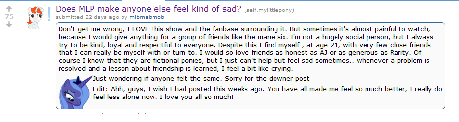 - I agree with Lord Tony on this. The show just isn't very lulzy without the brony drama that surrounds it. I doubt the show would even have an article on ED without them. — Preceding comment added by BakaRed (talk • contribs), who is too much of a fucking retard to sign their own posts. IT'S FOUR TILDES (