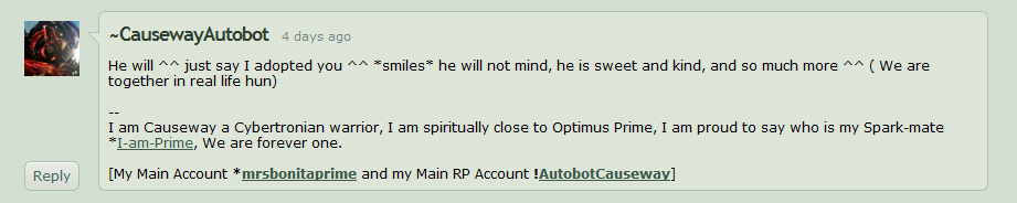 I checked the front page and saw that no one had added Bonita's new account CausewayAutobot. She says this is the account she uses to play with her 'true sparkmate' i-am-prime. Didn't she say the exact same crap with LastPrimeOfCybertron? I mean kudos to Bonita if she really did find a man that would put up with her stupidity but I'm betting it's just another ploy. Unseen 21:50, 23 April 2012 (EDT)