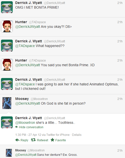 For the fags that don't know it, Derrick J Wyatt did all the art for Transformers Animated. He met Bonita yesterday. Here's his tweets.