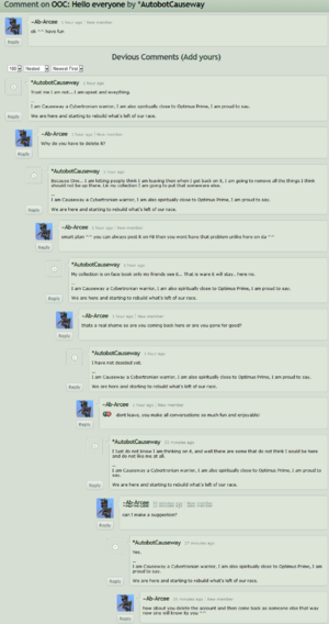 Things become curiouser and curiouser as I found Bonita to have deactivated her main account. On her AutobotCausewayaccount she's stated that she's going to overhaul it and she's very 'upset and is going to be tight as to why'. Anyone have any insight on this development? Unseen 16:13, 3 June 2012 (EDT)