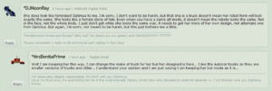 We all know Causeway is just Optimus with robo-tits but in Bonita's mind that seems to equal totally original. When faced with a critique of the character's design, calling her out, she responds with this.Unseen