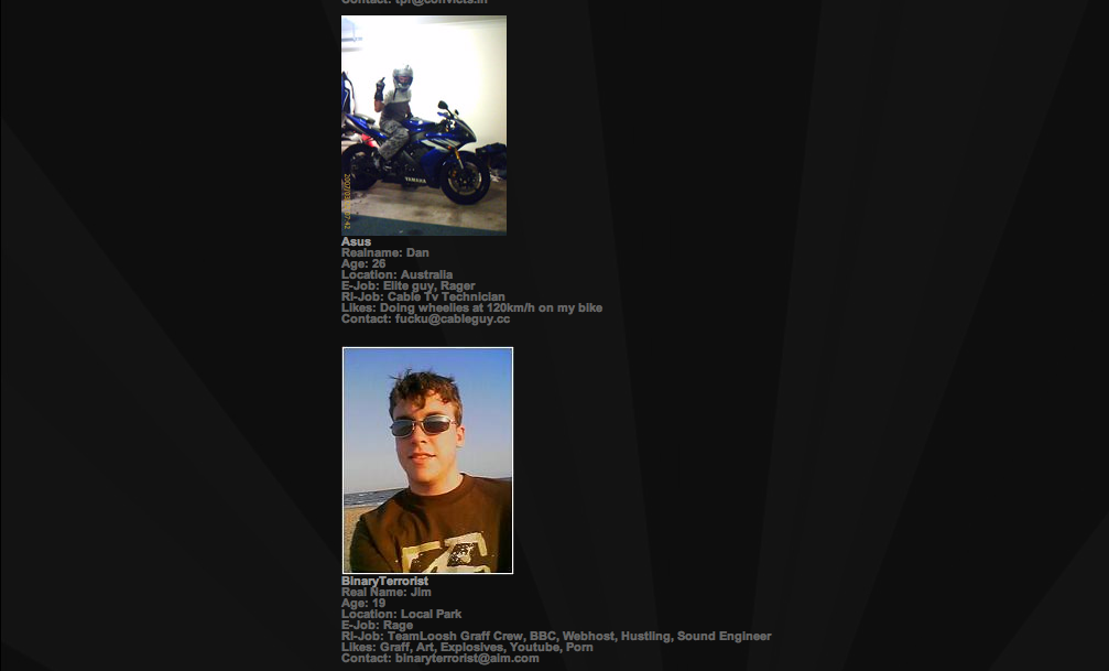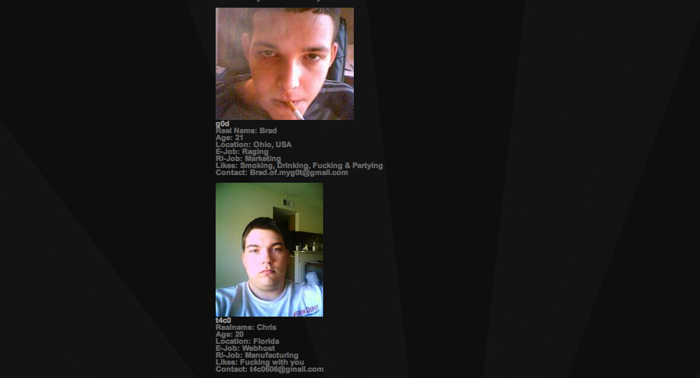 Initially, it was suspected that her former skiddie crew teamdouche did brb, compromised after an e-detective had found compromising IRC chat logs. Howevar, it turns out that she'd long since been on the outs with them and actually helped Anonymous Borg when they dropped her dox on their site (which has since been suspended for said dox). teamloosh is apparently about to be removed from their servers :O