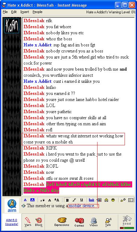 Like most fat, hideous, basement dwellers, IHM has been known to do a lot of online dating. Most, if not all of her e-lovers have been trolls, cheaters, or complete faggots. Trolling IHM by pretending to be a lover is a common pastime, and follows a very simple pattern: Tell her you think she can hack and is "boss," let her develop a high-strung emotional attachment (built on a terrible inferiority complex that probably has to do with her height, loneliness and the ability to set off metal detectors from a distance), and when she gets to the point of trying to be on the phone with you 24/7, tell her to fuck off. You will receive her terrible wrath of text message spam and threatening to get someone else to hack you, and receive such delights as live video feeds of wrist-cutting. This whole process takes about a day or two, which is also the length of time most can tolerate it for. The current record is somewhere around 2 weeks, done by someone with an IRL girlfriend to help them.