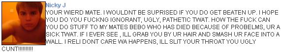 The last comment on Nathaniel Pritchard's Bebo was from his mannish girlfriend saying;