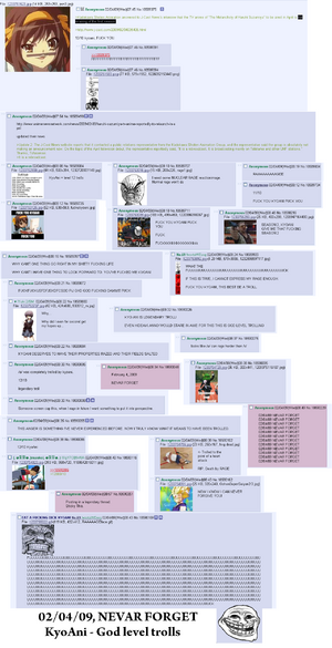 As Anonymous both loves and hates Haruhi with a passion, bringing the series up is a known way to start flamewars in /a/ (and /b/ at times). You can also pwn silly theism vs. atheism drama debates on /b/ by spamming pictures of Haruhi.