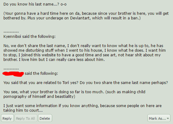 kyenniboi joined in the fun of DeviantSHART. As a 12 year old tartlet being born into the motherland, she didn't know that her half-brother at the time was on DA until the news was being shoved up her own asshole like a wooden pole. Now getting so fed up with hearing about Tori doing illegal shit, she finally posted her very first journal about him and expressed her own opinion about the situation.