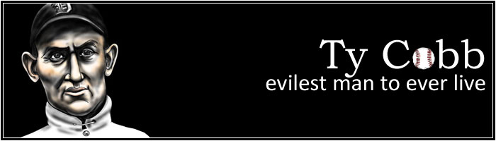 Generally regarded as a mass murderer and child molester by the unwashed hordes who don't know baseball, Ty Cobb (also known as "The Georgia Peach") was born over one hundred years ago, and is remembered as a violent, competitive, offensive, fierce, driven and strange man. If he were alive today, he wouldn't want to be remembered any other way. What normal people consider "character flaws" were to Ty shining examples of how a grown man should comport himself in all situations. Ty is often labeled a racist bastard by his present-day detractors, but they don’t seem to understand that Ty wasn't racist; he hated everybody with an equal amount of fury.