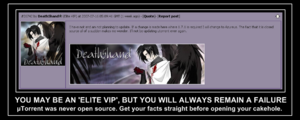 PROTIP: for instant drama, start a thread on any tracker's forum about how µTorrent should be banned if it's allowed or how it should be allowed if it's banned. Try to make it offensive enough to enflame idiots, but not too much so you don't get banned right away. Best targets are porn trackers or moneymaking trackers (think bitsoup.org). Alternatively, shoot at it until it dies.