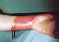 It would require skin grafts and lots of treatment. Source of what these scars would look like irl, as well as proof that when you slip and fall you would not get your whole arm up to your elbow into the deep fryer. However, the fall angle is debatable, the story of only a week in a burns unit is impossible as well as the not leaving scars part is nothing short of a huge whopper of a lie.