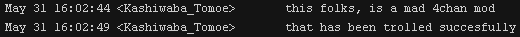 Despite Kashiwaba Tomoe's best efforts the irc ban kept getting reapplied. Now it might seam like the fun is over once the hammer has been dropped but not necessarily. Especially not when more than one person is in on the trolling.