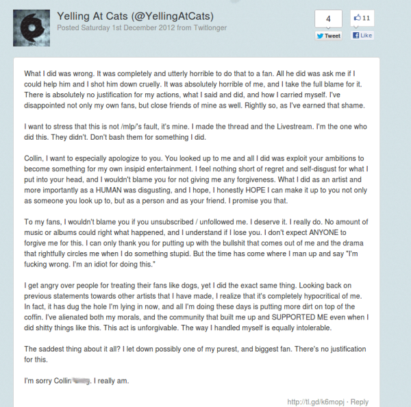 Fortunately, F3nning, another fellow Brony musician, had his bullshit meter filled past the brim, and created a gigantic post on tumblr exposing Yelling at Cats for the lying scum he is (see right). While it may seem TL;DR at first, it is at least worth a once over as it explains how everything that went wrong was actually Cats own fault. The more the post was reblogged, the more other musicians and various other bronies began to come out to express how they had had enough from Cats and he needs to wisen the fuck up for once in his existence.