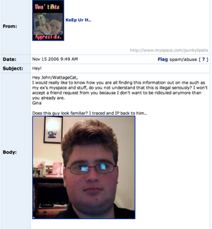 Then DangerDan got doxxed by Wattage and he suddenly lost all his bravery. He deleted his MySpace, only to have it resurrected by Wattage minutes later (since that URL was now available). Seeing how the first MySpace Adventure went so well, Wattage applied the same formula to DangerDan, and began messaging people on MySpace on his behalf, this time with tough guy's dox all over the profile.