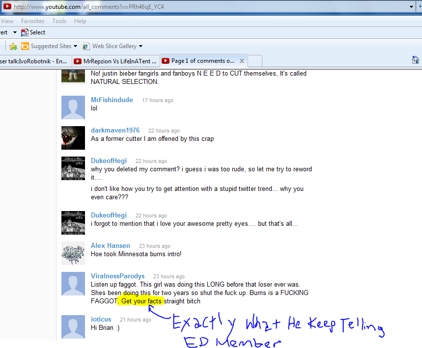 Sorry to bother you but there seems to be a problem with RepzionBuster. He keeps changing false information on MeganSpeaks and LifeInATent, and then bad mouths me and other people to "GET THE FACTS STRAIGHT!!". I don't see any links or pictures from him. I did work on that article for a year now and all he contribute is shit talking and changing names around without proof. Please take care of this before more drama rises. Thanks. Ivo Robotnik: SnooPING AS usual I see! 07:01, 10 January 2013 (EST)
