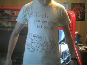 When one student from Schitmont High School learned of the tragic event last Thursday, he could not help but laugh his ass off. To express his feelings, he made a shirt, bearing the words "V-Tech just got pwned lol >.< XD". On the bottom of the shirt was a depiction of the massacre, where at least 100 noobs lay on the ground. Cho victoriously says "I R cooreen lol", and "wheres my GF.". Not shown on the back are the words "This didn't have to happen lol".
