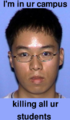 In apparent possession of another Azn student; Cho once again came back from the grave for extra lulz. This time as Haiyang Zhu, a graduate student, to claim his 35th victim from the school, which somehow puts him 36-0 for the spree (the 33rd being himself pwned).