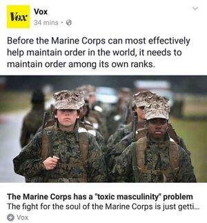 On Memorial Day 2017, they brilliantly posted an article about how "toxic masculinity" is a hot button "issue" in the Americunt military, namely the Marine Corps. Yes, because men are clearly the issue, right? To nobody's surprise, this caused a shitstorm.