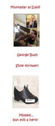 As he stood at the podium being his usual smugfag self, patting himself on the back for a job well done, one of the thoroughly vetted, professional reporters for the Iraqi media stood up and lobbed two shoe grenades he'd cunningly snuck through security at Bush's head, whilst calling him "a dog".