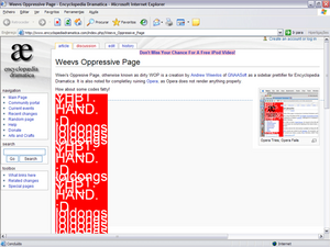 Weev's Oppresive Page, otherwise known as dirty WOP is a creation by Andrew Weevlos of GNAASoft as a sidebar prettifier for Encyclopedia Dramatica. It is also noted for completley ruining Opera, as Opera does not render anything properly.