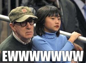 He was outed as a pedophile by way of being caught by his aging girlfriend Mia Farrow having sex with his barely legal, Asian whore of a step-daughter. (It should be noted that Mia in her own winsome teen years stole elderly Mafioso Frank Sinatra from his wife Ava Gardner and stole Andre Previn from his wife Dory). Only the fact that Mia Farrow couldn't prove 100% that her adopted daughter was underage when Woody fucked her saved Woody from utter ruin, though his career never recovered (Woody Allen on the other hand, has stated that the scandal didn't ruin his career, his shitty movies from the 1990s did).