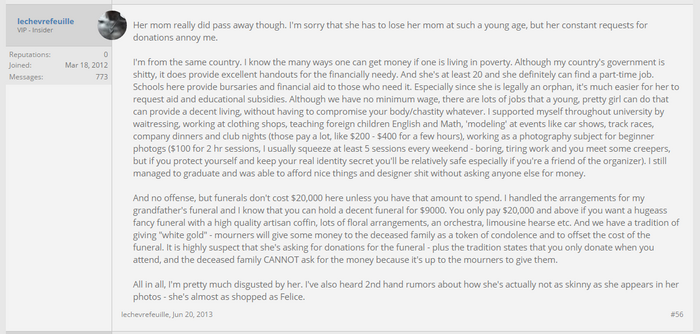 A few fellow Singaporeans have chimed in on Wylo's panhandling, elaborating that the $20,000 would only be for a super fancy funeral, and that traditionally, relatives of the dead would receive free money gifts anyway. So there you have it, folks. Wylona using her dead mother to sucker in some cash. Good job, Wylona!