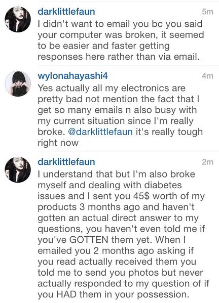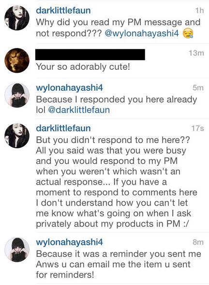 Recently Wylona has failed to follow through on promoting items from certain stores online. She would ask for items to get sent free, then she would just ignore all further messages from store owners as soon as she gets the items. When she DOES reply, she'll just make all kinds of excuses (like her being busy, her computer being broken, or she's too sick), and then just continue to ignore them. She has even gone as far as blocking these store owners from her social media accounts.