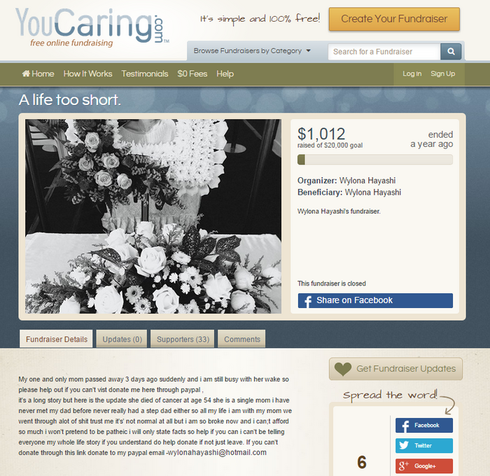 First, during the last stages of Wylona's mother's life, Wylona decides to open a Youcaring.com donation fund. The donations were supposedly for Wylona to have a proper funeral for her mother. But Wylona also seizes the opportunity, and decides to ask for whooping $20,000. That's right: 20 fucking thousand dollars. For a funeral.